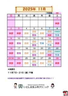 お知らせ 2025/10/29 11月のお知らせ ~休診日~11月7日(金)午後、11月21日(金)午後第1、3、5土曜日 他日曜祝日 11月より土曜診療を行います。土曜日は午前診療のみとなりますので お間違えのないようお願いいたします。
